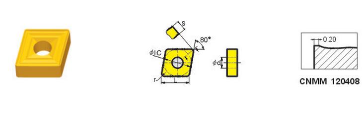 CNMG120404(YBD151):高耐磨性基體與MT-Ti(CN)、厚Al2O3、TiN 涂層的極佳組合,是球墨鑄鐵與灰口鑄鐵加工的首選牌號,允許有較高的切削速度。